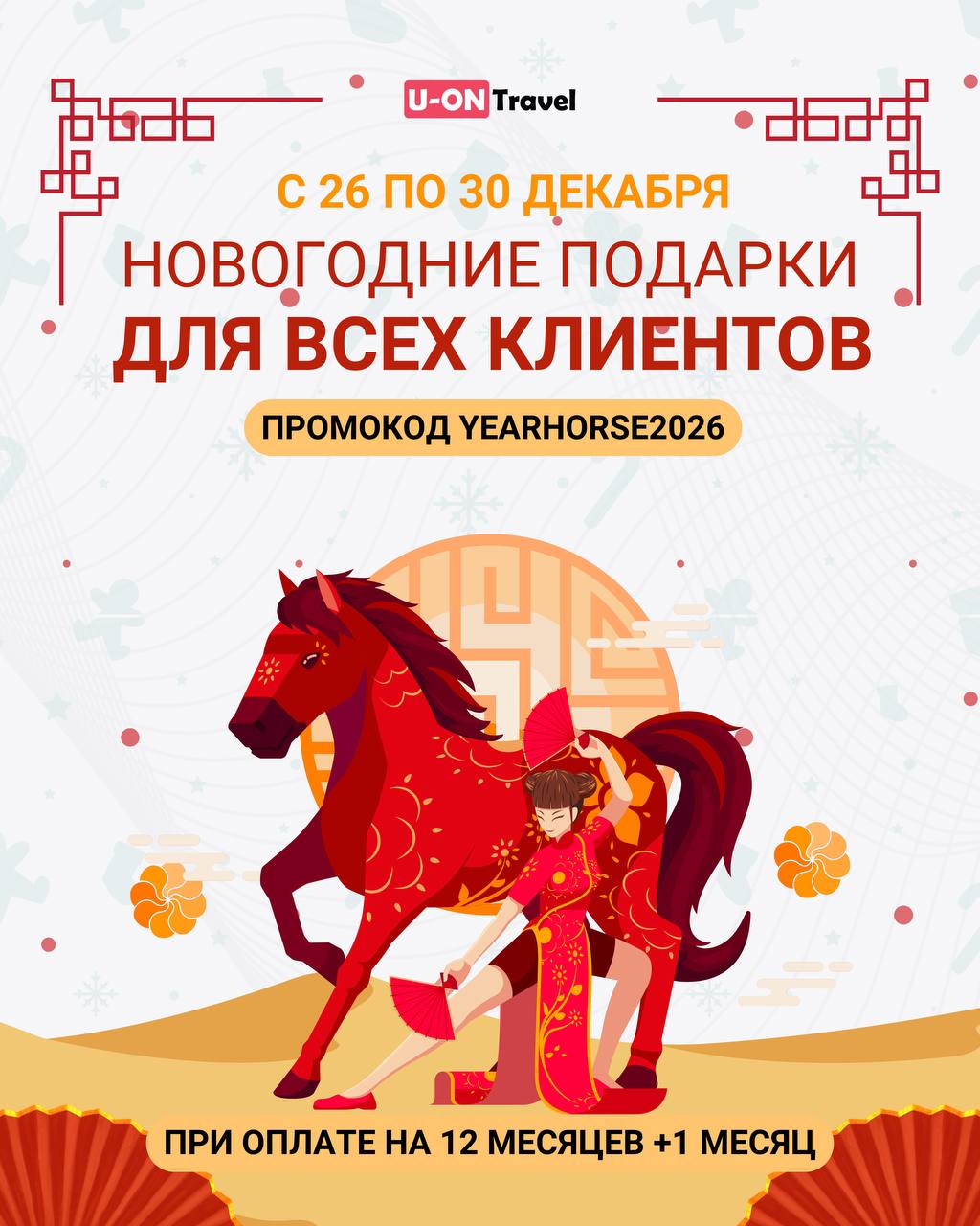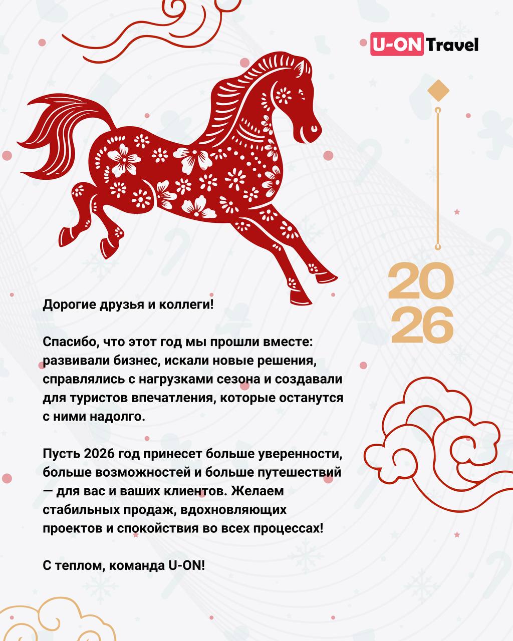 Дорогие друзья и коллеги, команда U-ON.Travel поздравляет вас с наступающим 2026 годом!