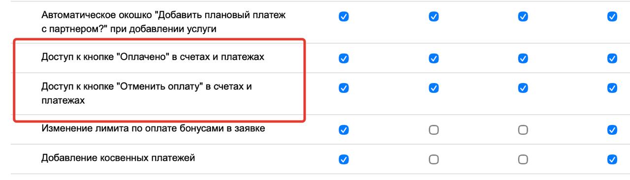 В правах доступа добавлены два пункта для кнопок в счете "Оплачено" и "Отменить оплату"